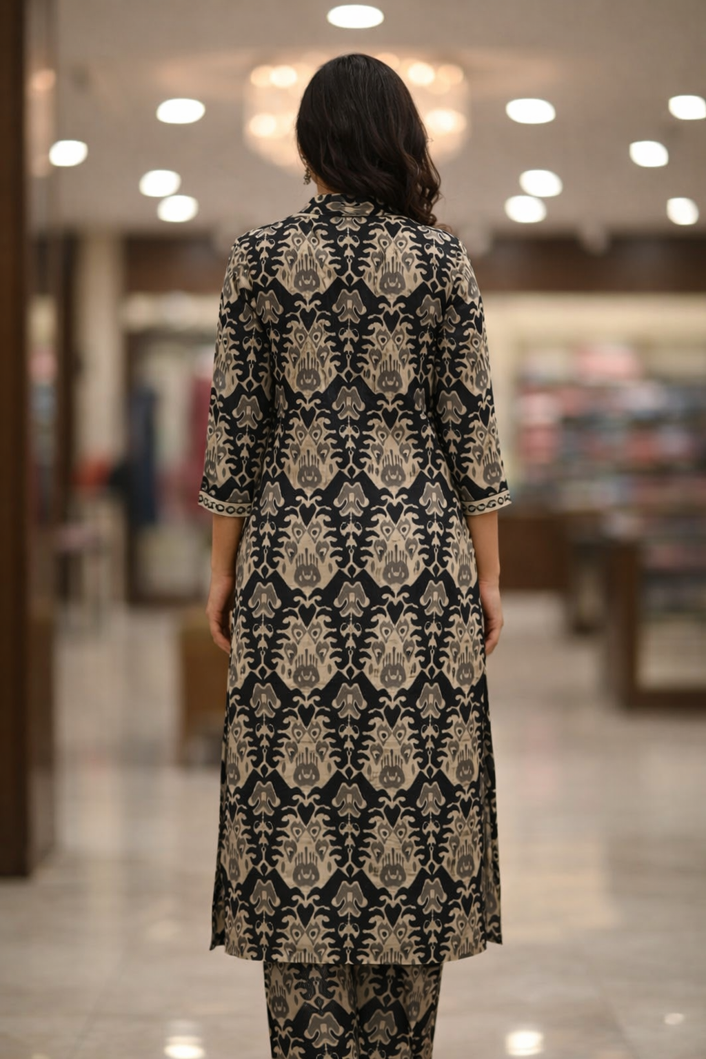 Step into timeless elegance with this Black & Beige Printed Kurta Set, crafted for women who appreciate classic prints with a refined modern touch. Featuring an all-over traditional motif, the kurta showcases a harmonious blend of black and beige tones that never go out of style.