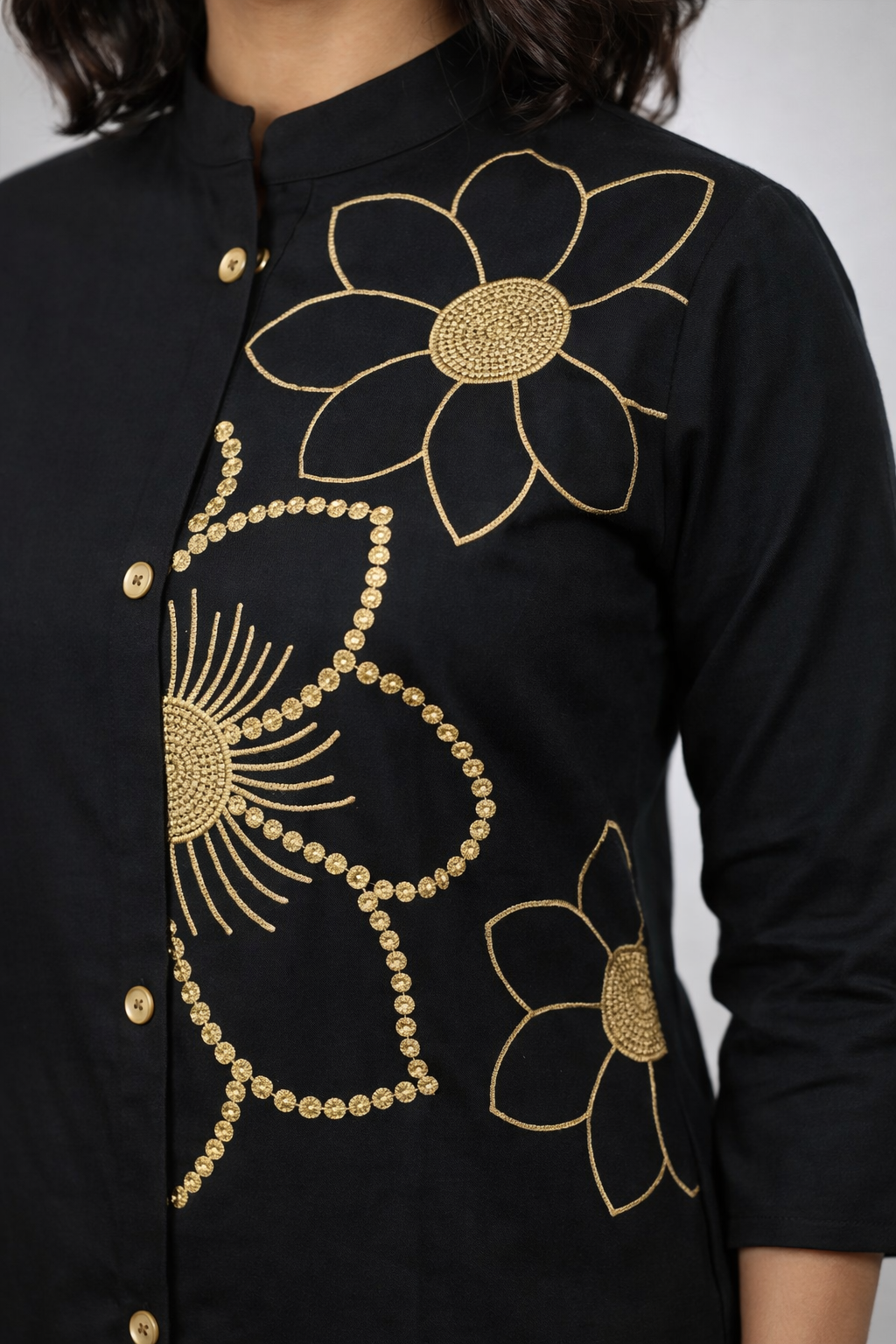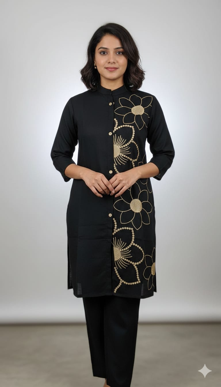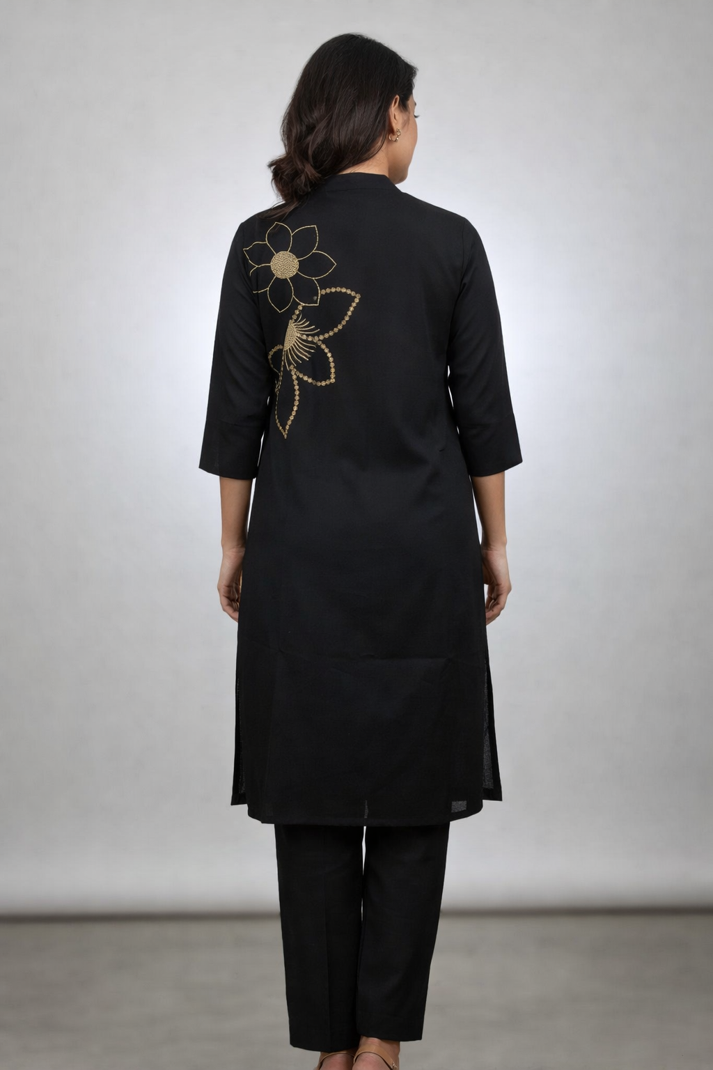 Make a statement with understated elegance in this Black Embroidered Kurta Set, designed for women who love classic silhouettes with artistic detailing. The kurta features a sleek straight cut enhanced acknowledged with intricate gold floral embroidery, creating a striking contrast against the deep black base.