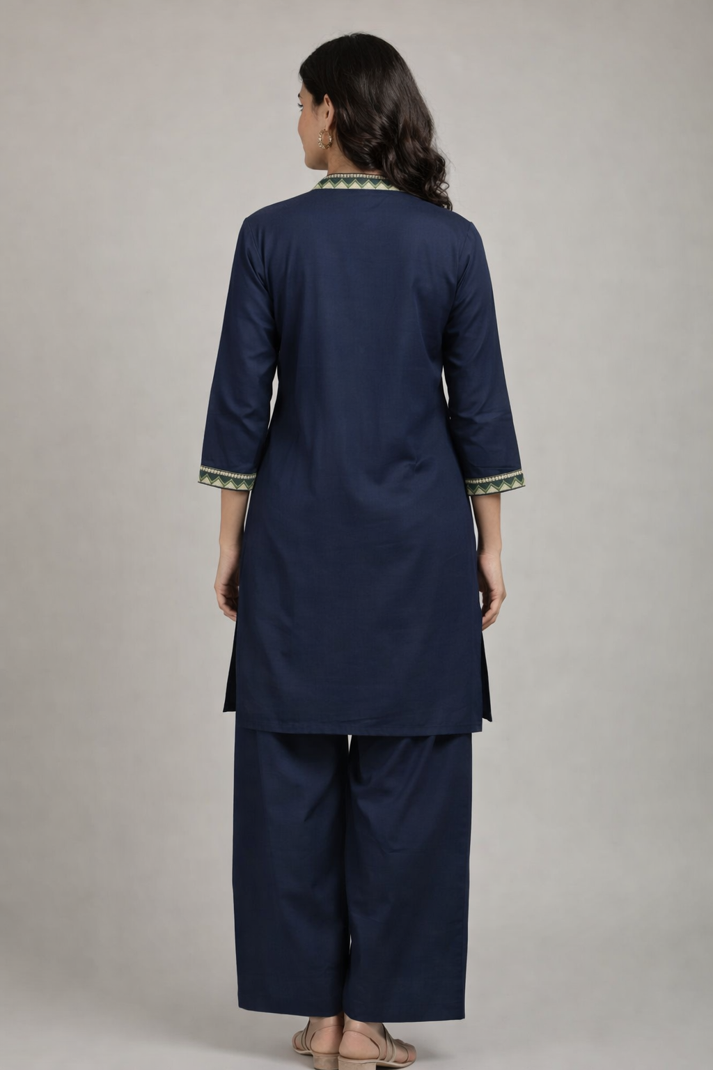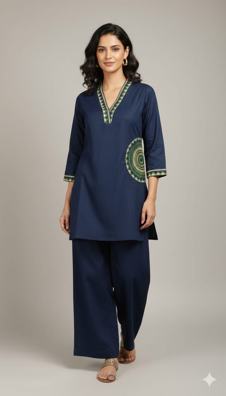 Refresh your ethnic wardrobe with this effortlessly stylish Navy Blue Co-ord Set, designed for comfort with a touch of artistic elegance. The kurta features a flattering V-neckline highlighted with green geometric border detailing, adding contrast and visual interest to the rich navy base.